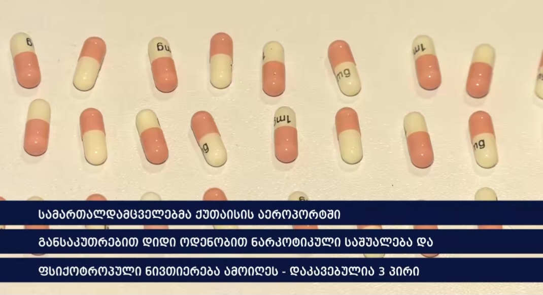 სამართალდამცველებმა, ქუთაისის საერთაშორისო აეროპორტში, ბრალდებულების ხელბარგის შემოწმებისას, განსაკუთრებით დიდი ოდენობით ნარკოტიკული საშუალებისა და ფსიქოტროპული ნივთიერების შემცველი აბები ნივთმტკიცებად ამოიღეს.