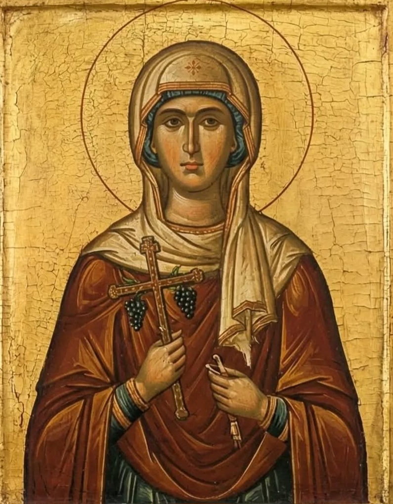 წმინდა ნინო წარმოშობით კაბადოკიის ქალაქ კოლასედან იყო. მისი მამა – ზაბულონი საფრანგეთის განმანათლებლად ითვლება. წმინდანი საქართველოში, დაახლოებით 323 წელს, ჯავახეთიდან შემოვიდა. მას ღვთისმშობლის მიერ ბოძებული ვაზის ჯვარი ეპყრა ხელში.